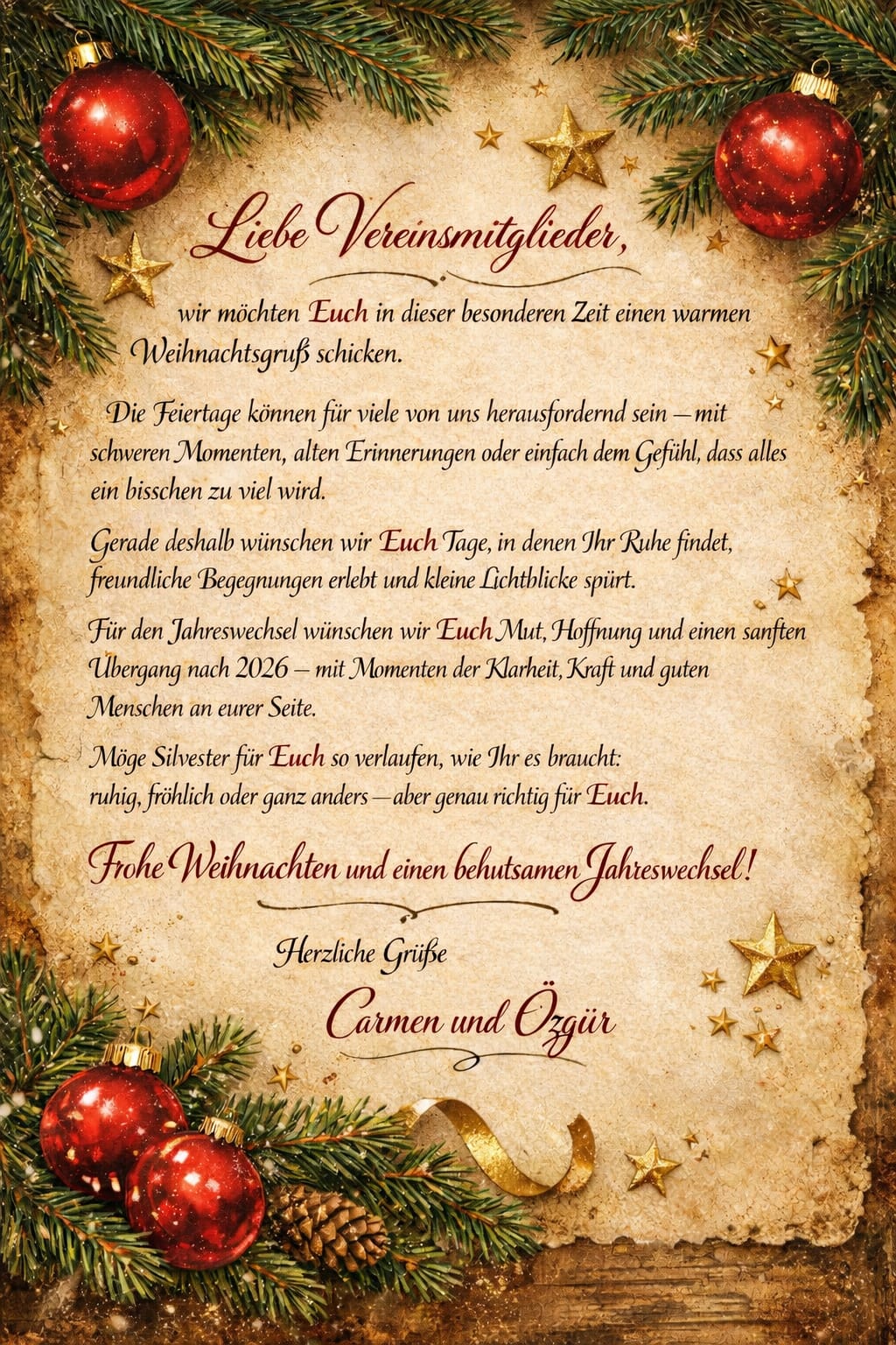 Liebe Vereinsmitglieder, wir möchten Euch in dieser besonderen Zeit einen warmen Weihnachtsgruß schicken. Die Feiertage können für viele von uns herausfordernd sein – mit schweren